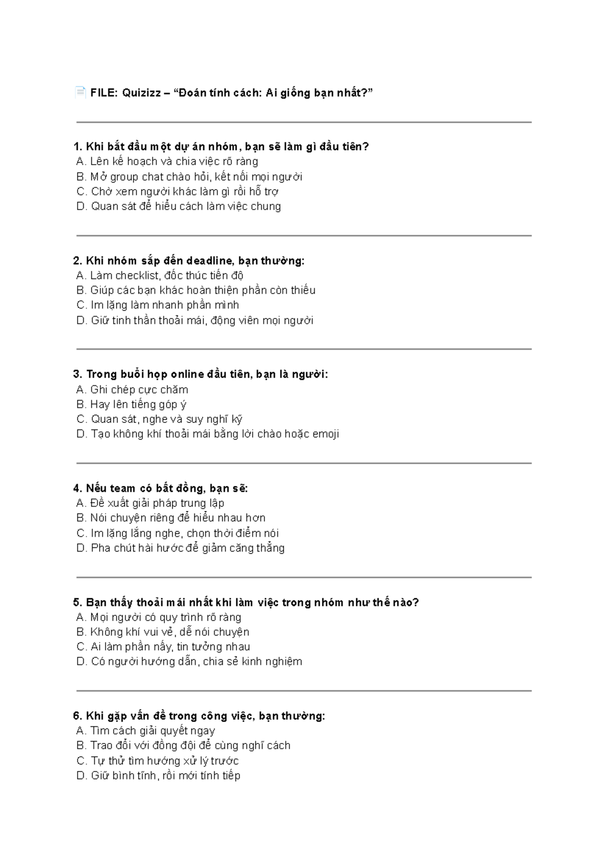 Khi tham gia quiz, điều này không chỉ giúp bạn tự nhận thức mà còn tạo ra không khí thân thiện và gần gũi giữa nhóm bạn. Hãy trả lời một cách trung thực, bạn sẽ thấy bất ngờ khi phát hiện ra những điều thú vị về chính mình và những người xung quanh.