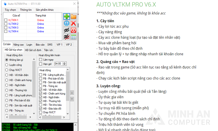 Một số tính năng nổi bật của Auto VLTK Mobile bao gồm AutoTrain luyện công để tăng cấp nhanh chóng, cũng như tự động tham gia các hoạt động Bang Hội như Võ Lâm Minh Chủ hay Tranh Đoạt Lãnh Thổ. Đặc biệt, phần mềm còn giúp game thủ tiết kiệm thời gian với tính năng tự động login, giúp bạn không phải lo lắng khi tài khoản ngắt kết nối.