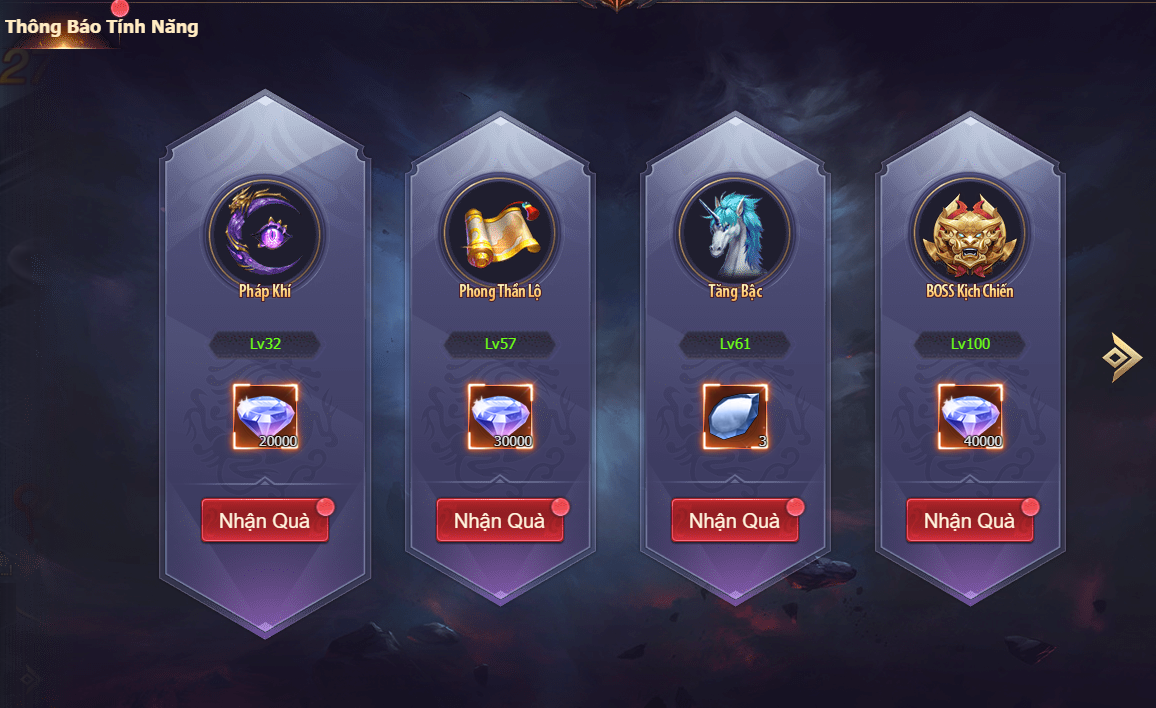 Người chơi chỉ cần truy cập vào mục nâng cấp để xem những trang bị, đồng hành hay tọa kỵ có thể cải thiện sức mạnh cho nhân vật. Một điều cần lưu ý là tham gia chương trình VIP, mỗi 1.000 VNĐ sẽ tích lũy thành 1 điểm, giúp người chơi mở khóa nhiều đặc quyền hấp dẫn.