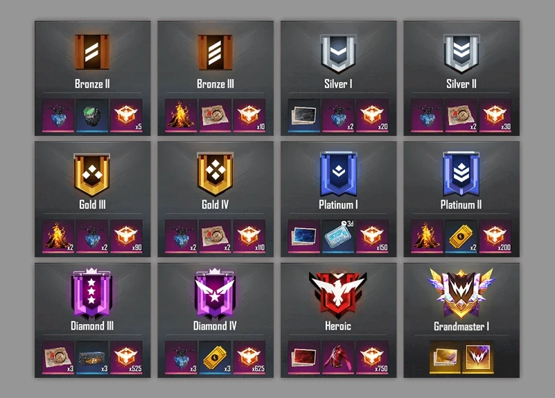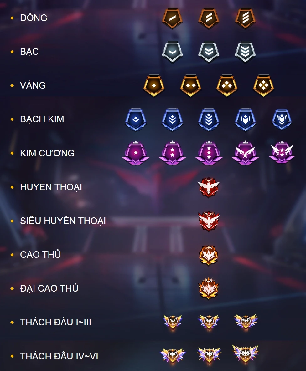 Trong Free Fire, hệ thống xếp hạng gồm nhiều mốc rank khác nhau, từ thấp đến cao, tạo nên một sân chơi cạnh tranh hấp dẫn cho người chơi. Mỗi rank đều được chia thành các cấp bậc nhỏ hơn, bắt đầu từ Đồng với ba cấp (I, II, III) và Bạc cũng với ba cấp tương tự. Tiếp theo là rank Vàng, Bạch Kim và Kim Cương, mỗi loại đều có từ ba đến bốn cấp bậc.