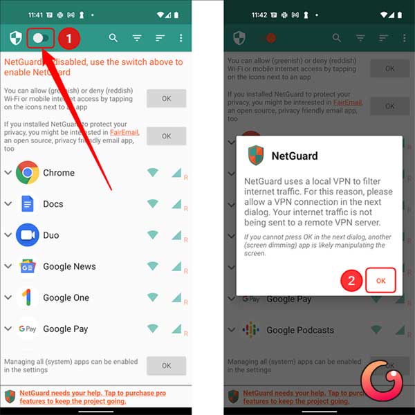 Ngoài cách này, bạn cũng có thể sử dụng các ứng dụng của bên thứ ba để tăng cường khả năng chặn kết nối. Một trong những ứng dụng phổ biến là NetGuard. Sau khi cài đặt thành công, bạn chỉ cần mở ứng dụng và kích hoạt nó bằng cách gạt nút ở góc trên bên trái màn hình. Với NetGuard, bạn có thể chặn Internet của từng ứng dụng mà không cần root thiết bị.