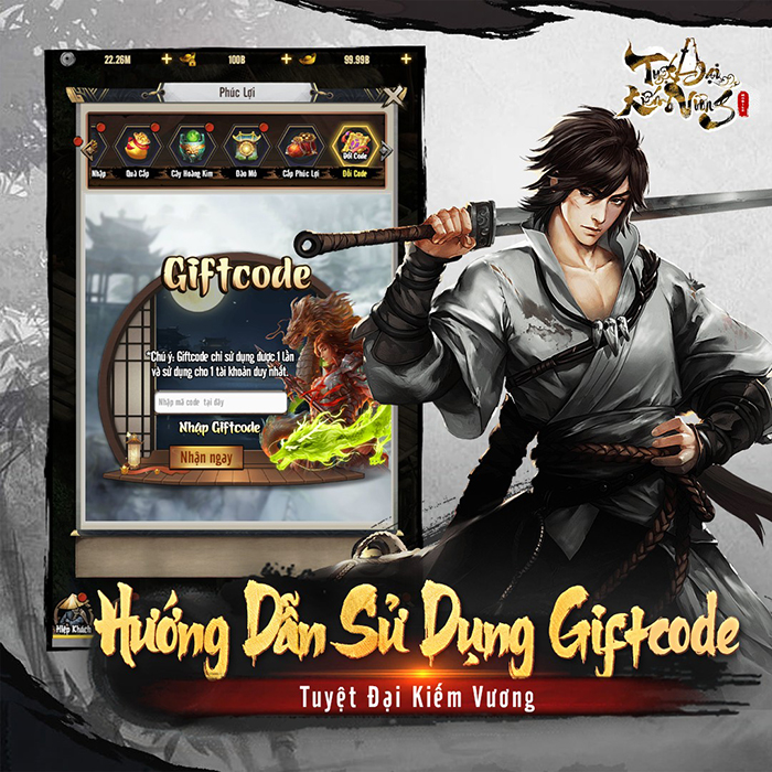 Đừng quên theo dõi các sự kiện trên fanpage để nhận thêm gift code đặc biệt nhé. Chỉ cần đạt đến cấp 30 và vào mục Phúc Lợi để nhập mã, bạn sẽ có cơ hội nhận những vật phẩm cực kỳ hữu ích trong hành trình chinh phục Tuyệt Đại Kiếm Vương. Hãy chắc chắn không bỏ lỡ nhé!