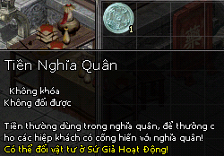 Ngoài ra, việc tham gia các hoạt động như Bao Vao Đồng sẽ gia tăng Danh Vọng của bạn. Những phần quà hấp dẫn như áo, nhẫn hay các món đồ đặc biệt khác đều được trao cho những người có Danh Vọng cao. Với khoảng 100 điểm Danh Vọng Nghĩa Quân, bạn còn có thể sử dụng Lệnh Bài Nghĩa Quân để mở rộng thêm nhiều cơ hội khác.
