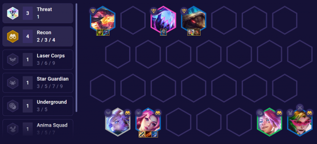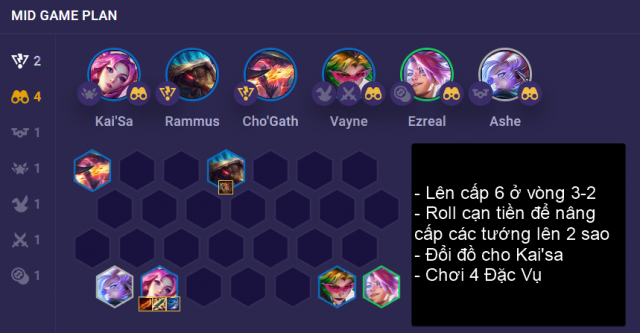 Trong meta hiện tại, Kai’sa trở thành một trong những quân bài chủ lực hot nhất nhờ vào những đợt buff gần đây. Bạn cần cố gắng có được Kai’sa ngay từ đầu Vòng 2, vì chỉ số SMCK cộng dồn vĩnh viễn từ cô ấy rất quan trọng cho cả trận đấu. Sắp xếp tướng ở vị trí yếu của đối thủ có thể giúp bạn kết liễu nhanh chóng các unit.