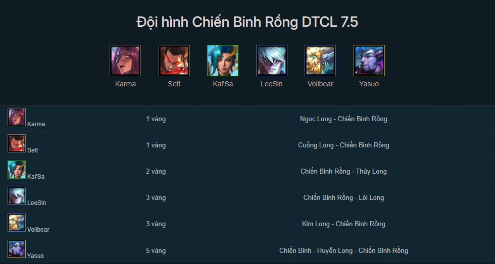Đội hình Chiến Binh Rồng trong Đấu Trường Chân Lý mùa 7.5 hiện đang là lựa chọn tuyệt vời cho những ai tìm kiếm sự kết hợp hoàn hảo giữa khả năng chống chịu và sát thương mạnh mẽ. Một trong những điểm mạnh của đội hình này là khả năng khống chế kẻ địch, giúp bạn kiểm soát trận đấu hiệu quả hơn. Bằng cách tập trung vào các tướng như Kai’Sa, Sett, Karma, Yasuo, Volibear và Lee Sin, bạn có thể tạo ra một đội hình cực kỳ linh hoạt và mạnh mẽ.