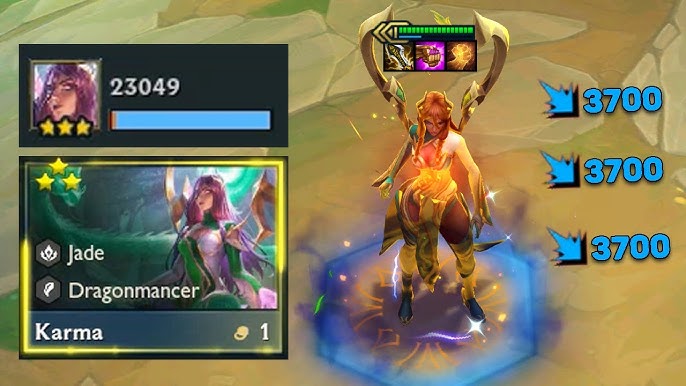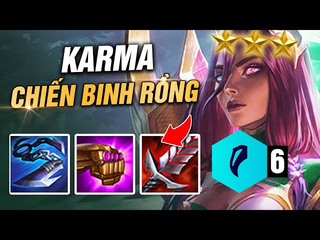 Karma, với vai trò chủ lực tích cực, trở thành nguồn sát thương chính của đội hình. Để tối ưu hóa sức mạnh của Karma, người chơi nên trang bị cho cô các món đồ như Găng Bảo Thạch và Mũ Phù Thủy. Đặc biệt, hiệu ứng Chiến Binh Rồng tạo điều kiện cho đồng đội gây ra những cú đánh mạnh mẽ, làm kẻ địch không thể cản nổi.