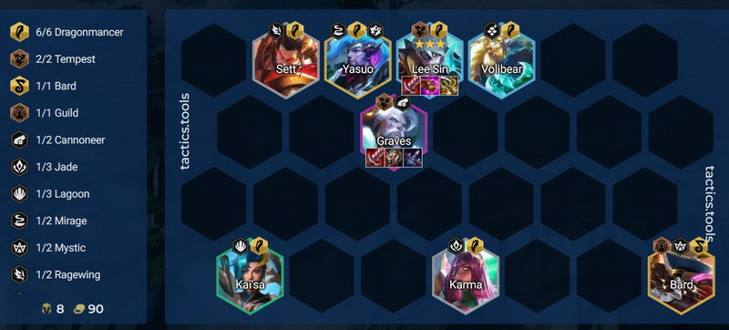 Một trong những điểm mạnh của đội hình này chính là khả năng khống chế kẻ địch nhờ những hiệu ứng từ các tướng Chiến Binh Rồng. Lên cấp nhanh chóng lên 8 giúp bạn dễ dàng có được các tướng mạnh, từ đó tối ưu hóa sức mạnh đội hình. Trang bị cho Karma với Bùa Xanh, Manazane hay Jeweled Gauntlet sẽ tăng cường hiệu quả gây sát thương cũng như khả năng phục hồi năng lượng.