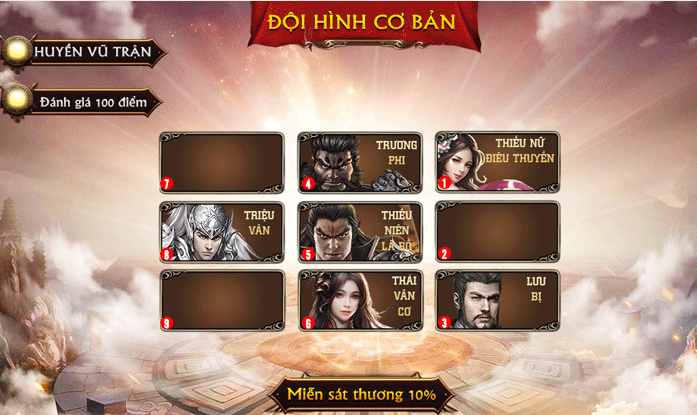 Khi đã quen dần với game, người chơi có thể thử sức với đội hình cao cấp, bao gồm các tướng như Tôn Thượng Hương, Tôn Quyền, và Mã Văn Lộc. Đội hình này không chỉ mang lại sức mạnh tấn công đáng nể mà còn có khả năng phòng thủ linh hoạt. Thúc đẩy chiến thuật của bạn lên một tầm cao mới với các lựa chọn đa dạng.