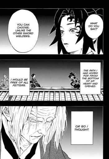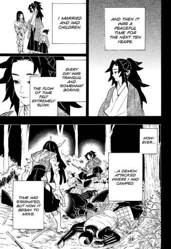 Hơn nữa, chương này khắc họa sự cô đơn mà Michikatsu trải qua khi không có Yoriichi ở bên. Ông sống trong những năm tháng tĩnh lặng nhưng cũng đầy bất an, và việc Yoriichi rời đi chính là nguyên nhân cho sự thiếu thốn tình cảm trong cuộc đời ông.