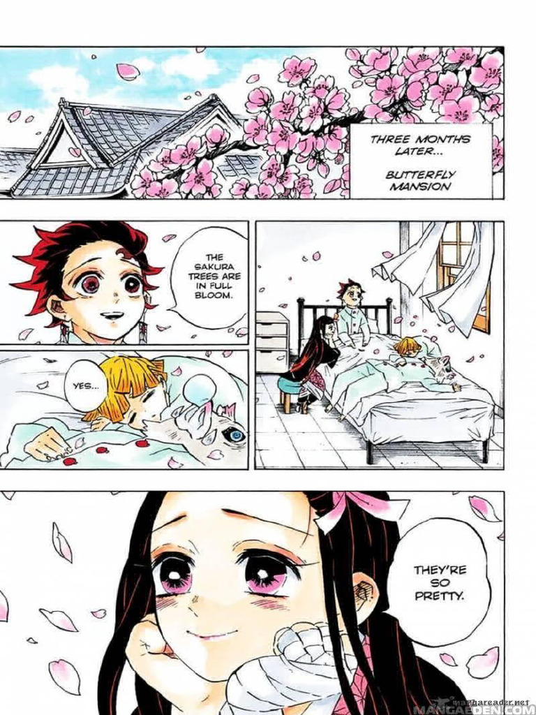 Với tiêu đề “Thế giới không còn bóng quỷ”, chương này khẳng định sự quyết tâm của tất cả những nhân vật còn sống. Họ không chỉ phải đối mặt với những di chứng của cuộc chiến mà còn phải xây dựng lại cuộc sống mới trong một thế giới không còn quỷ. Tanjirou đã trải qua sự thay đổi lớn khi bị Muzan hóa quỷ nhưng may mắn được cứu chữa.
