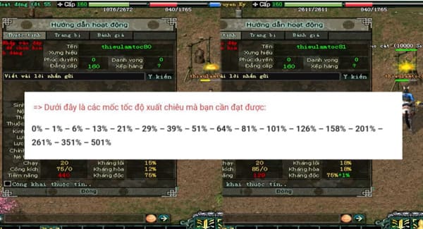 Tốc độ đánh và tốc độ xuất chiêu là những yếu tố quyết định sự thành công trong các trận chiến tại Võ Lâm 1. Để tối ưu hóa khả năng chiến đấu của nhân vật, việc nắm rõ các mốc tốc độ đánh là rất quan trọng. Những mốc này được phân chia thành các tỷ lệ: 40% — 80% — 120% — 160% — 200%. Tốc độ đánh càng cao, nhân vật càng có khả năng gây sát thương lớn trong khoảng thời gian ngắn.
