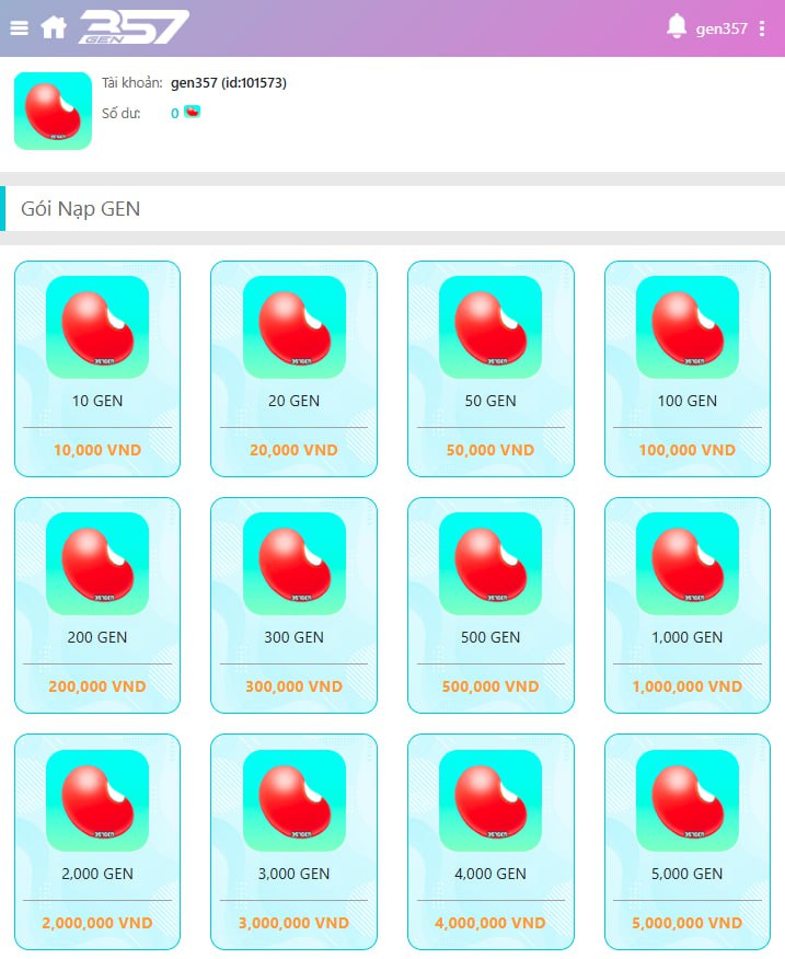Nếu bạn đang muốn nạp thẻ cho game Thiên Hạ Ngũ Tuyệt, hãy làm theo các bước hướng dẫn sau đây để có trải nghiệm nạp thẻ nhanh chóng và thuận tiện nhất. Đầu tiên, bạn hãy truy cập vào link nạp thẻ: https://pay.357games.vn/topup. Tại đây, bạn sẽ thấy nhiều gói nạp để lựa chọn, trong đó gói GEN là một sự lựa chọn hấp dẫn.