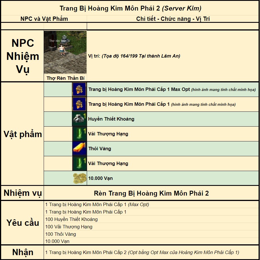 Trong nhiệm vụ Hoàng Kim, Thái công công đã nhờ bạn đi tiêu diệt Tiểu Kỳ Nhi tại tọa độ (226,205) ở Phục Ngưu Sơn Đông. Đây là nhiệm vụ không hề đơn giản, yêu cầu bạn phải chuẩn bị kỹ lưỡng trước khi đối mặt với thử thách. Sau khi hoàn thành, bạn sẽ nhận được các phần thưởng giá trị, bao gồm bộ trang bị Kim Phong dành cho những ai mới bắt đầu.