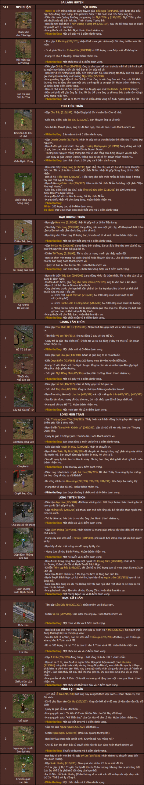 Đầu tiên, bạn sẽ gặp nhân vật Hổ Tử và nhận nhiệm vụ tìm kiếm một Võ sư cho con trai của ông. Sau đó, bạn sẽ phải đối thoại với Thiên Vương Tướng lĩnh để nhận phần thưởng là viên Tì Bà hoàn. Những nhiệm vụ này không chỉ giúp bạn tiến bộ về cấp độ mà còn mang lại cảm giác hào hứng khi khám phá thế giới rộng lớn của Võ Lâm.