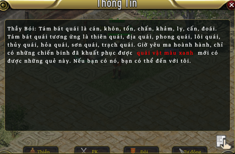Bắt đầu từ việc tìm kiếm, bạn sẽ gặp nhiều quái vật màu xanh, gọi là Lam Quái. Căn cứ vào thuộc tính của chúng, bạn sẽ thu nhặt được những quẻ khác nhau. Đây là bước đệm quan trọng để hoàn thành bộ sưu tập 7 quẻ. Sau khi đã thu thập đủ, trở về gặp Thầy Bói để nhận phần thưởng xứng đáng.