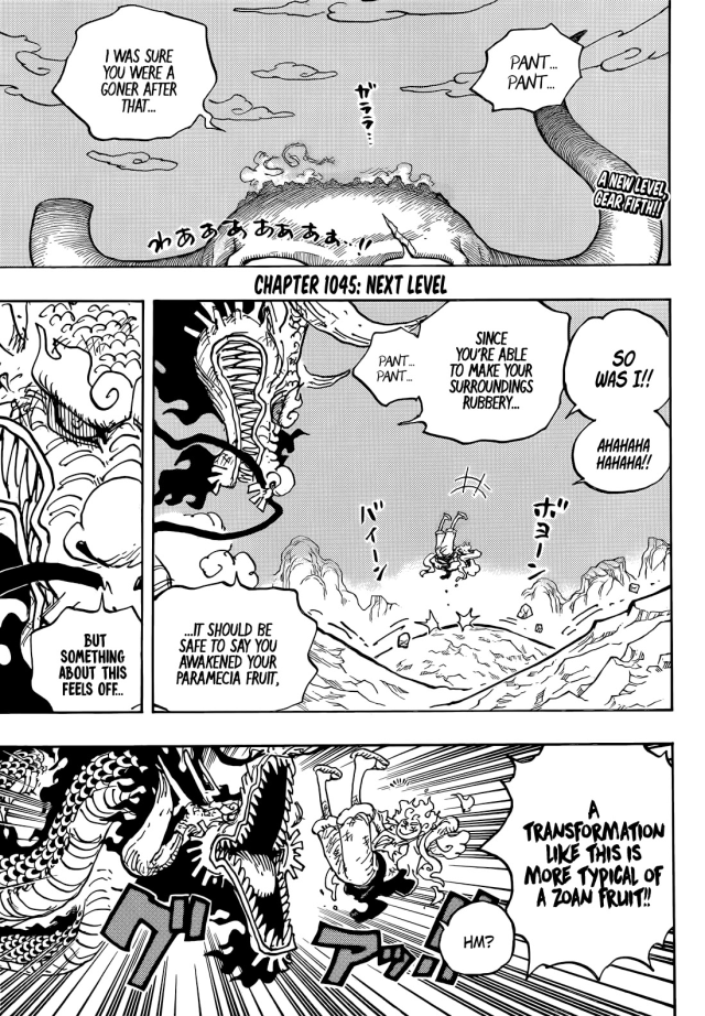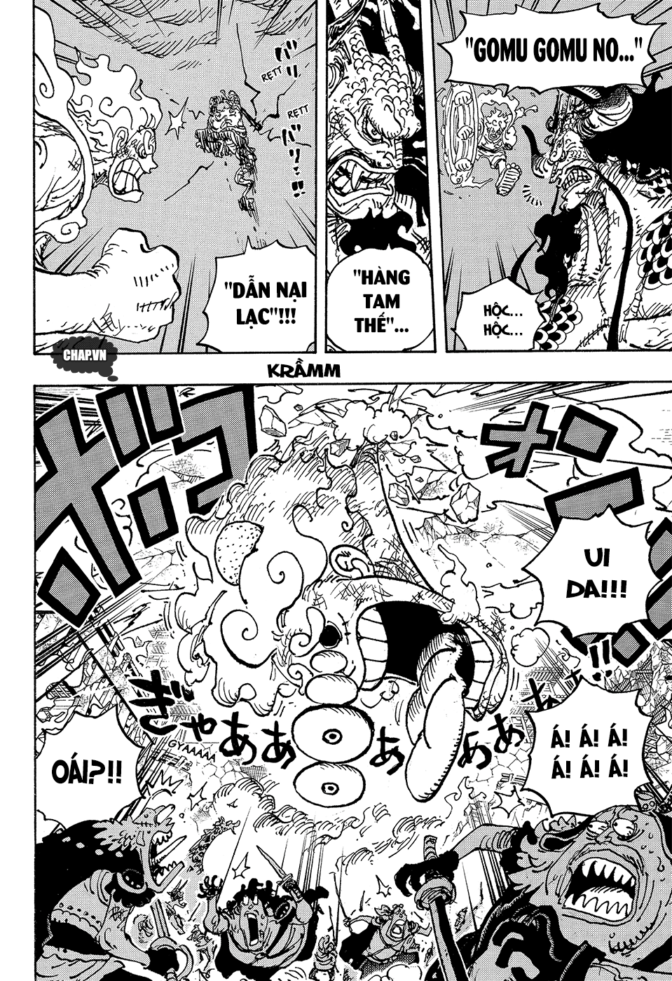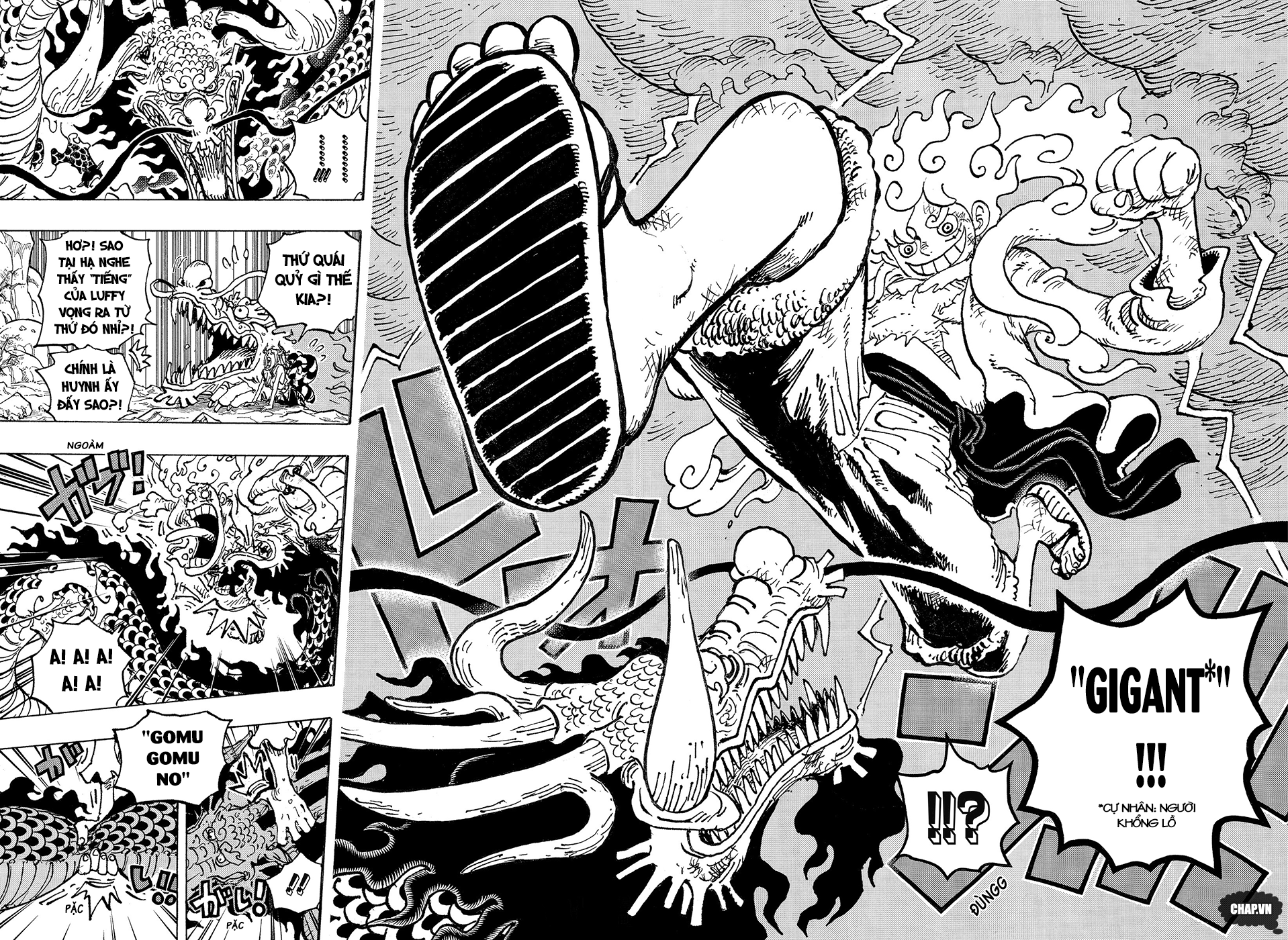 Toàn bộ chap là sự miêu tả trận chiến giữa hai nhân vật mạnh mẽ nhất, nơi Luffy không ngừng tỏa sáng với khả năng mới được đánh thức từ trái ác quỷ thần thoại Nika. Những pha hành động đặc sắc kết hợp với khả năng biến đổi môi trường đã mang lại cảnh tượng mãn nhãn cho người đọc. Luffy khiến Kaido phải ngạc nhiên khi liên tục gây sát thương, như một cơn lốc với trạng thái mới “khổng lồ”.