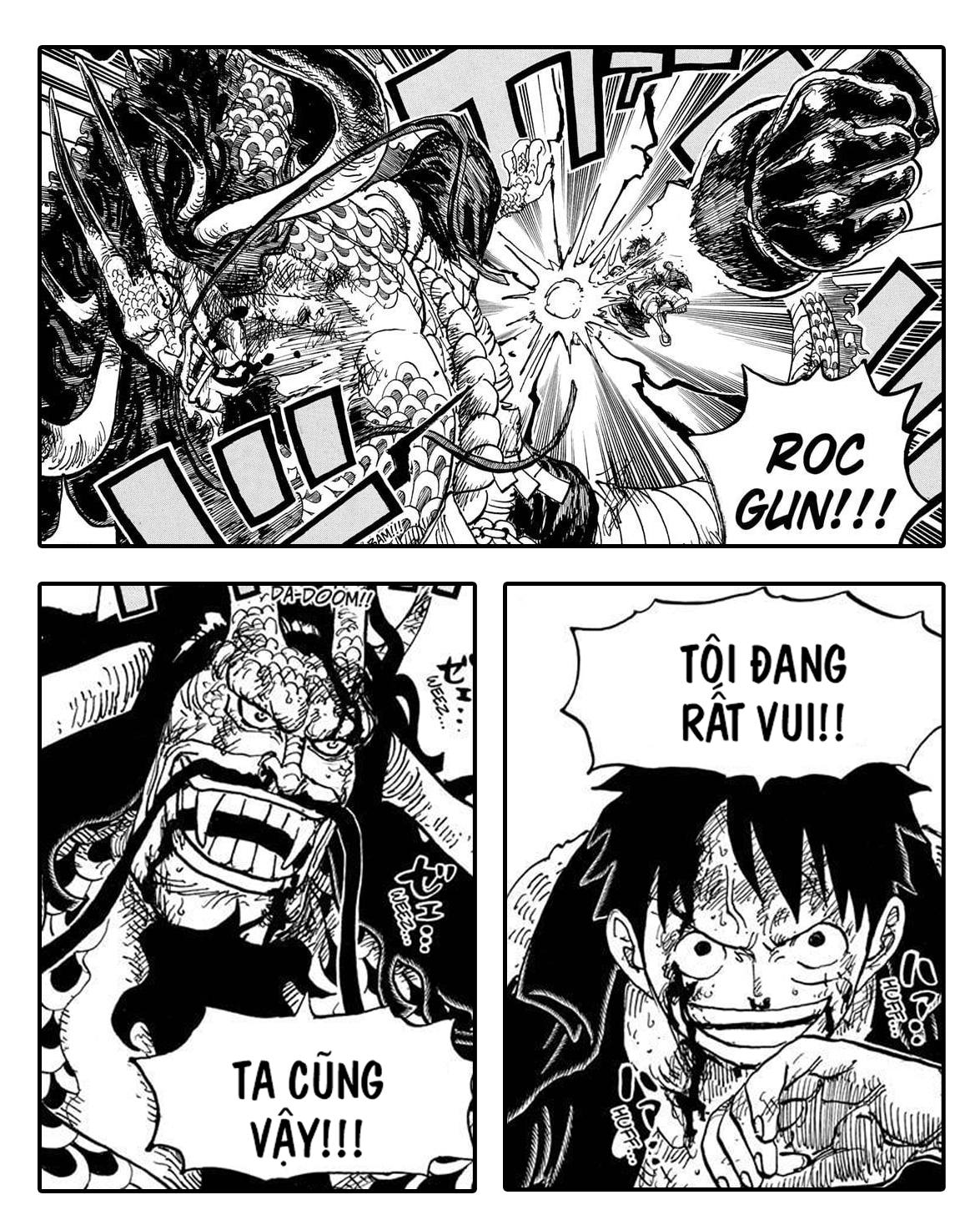 Chương truyện tạo ra nhiều tình huống hài hước và ly kỳ, khiến người đọc không thể rời mắt. Hình ảnh Luffy hóa “khổng lồ” và đấm mạnh vào mặt Kaido thật sự gây ấn tượng mạnh mẽ. Điều này cho thấy rõ sức mạnh và tính cách quyết liệt của nhân vật chính. Những câu thoại và biểu cảm của họ cũng khiến tình huống trở nên thú vị hơn bao giờ hết.