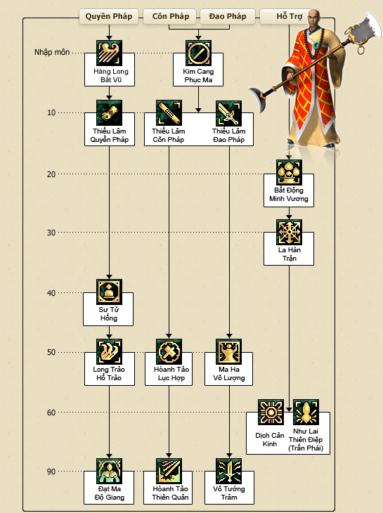 Thiếu Lâm Quyền được chia thành ba trường phái chính: đao pháp, côn pháp và quyền pháp. Trong đó, đao pháp “Vô tướng trảm” mang lại sự uy lực cho người sử dụng. Đặc biệt, các kỹ năng như Đạt Ma Độ Giang hay Đại Thừa Như Lai Chú được nâng cấp lên các level cao sẽ giúp tối ưu hóa lượng sát thương gây ra.