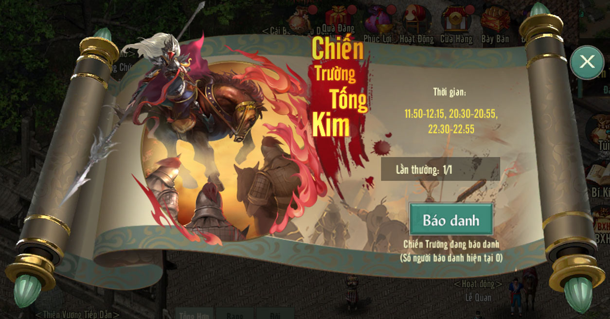Để tham gia, người chơi cần chú ý đến thời gian báo danh, được mở 10 phút trước khi trận đấu bắt đầu. Phí báo danh là 1 vạn lượng, không quá cao so với phần thưởng hấp dẫn. Điểm tích lũy từ các trận Tống Kim sẽ được sử dụng để đổi lấy kinh nghiệm, tạo động lực cho người chơi.