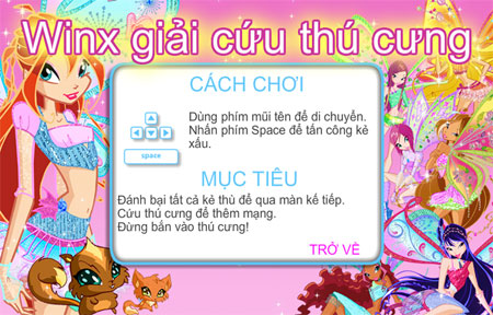 Trong game “Winx giải cứu thú cưng”, các con thú cưng đáng yêu của những nàng công chúa phép thuật Winx đã bị một kẻ xấu bắt cóc với âm mưu biến chúng thành quái vật. Người chơi sẽ vào vai các Winx để giải cứu những sinh vật dễ thương này, mang lại phép thuật trở lại Trái Đất. Game này rất thú vị và đã thu hút hàng chục ngàn game thủ tham gia.