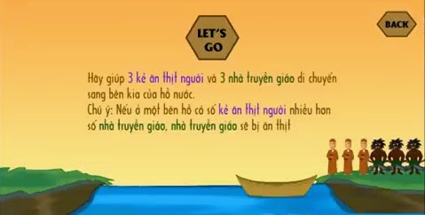Tiếp theo, sau khi đưa được 3 thầy tu qua sông an toàn, bạn chỉ cần một con quỷ lại để chở 2 con quỷ còn lại. Qua từng bước một, bạn sẽ cảm thấy hồi hộp nhưng cũng vô cùng thích thú khi giải quyết được bài toán này. Kết thúc, cả 6 nhân vật đều an toàn và bạn sẽ cảm nhận được niềm vui từ việc chiến thắng thử thách này!