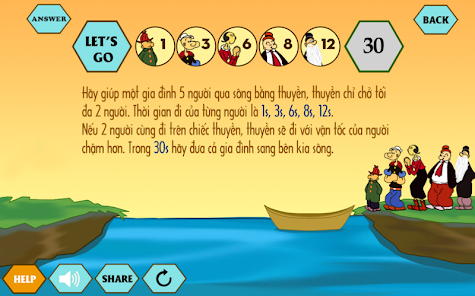 Chiếc thuyền có thể chở tối đa hai người cùng một lúc, và mỗi người có thời gian qua sông khác nhau. Các thầy tu mất thời gian từ 1 đến 12 giây, tạo nên một thử thách tính toán thời gian. Bạn cần chọn cách đưa người sao cho không chỉ đảm bảo an toàn mà còn tối ưu nhất về thời gian.