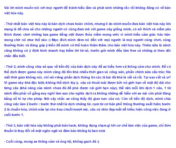 Tuy nhiên, để trải nghiệm tốt nhất, bạn nên tải bản việt hóa đầy đủ, mặc dù hiện tại vẫn còn một số lỗi nhỏ chưa được khắc phục. Các bạn có thể vào xem video hướng dẫn cài đặt từ tác giả để có cái nhìn rõ ràng hơn. Ngoài ra, nếu bạn muốn thảo luận hoặc đóng góp cho quá trình việt hóa này, đừng ngần ngại liên hệ với mình nhé!
